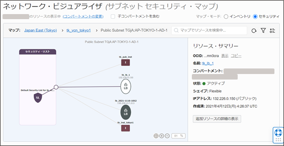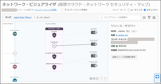 サブネット・セキュリティ・マップでは、リソースに関連付けられているセキュリティ・リストとネットワーク・セキュリティ・グループを確認可能