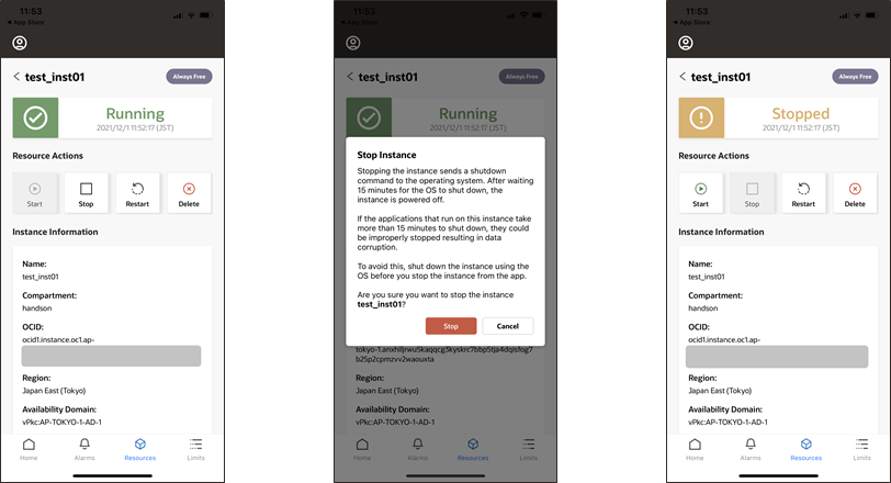これまでOCIモバイル・アプリではリソースの表示、監視のみが実施できましたが、リソースの起動/停止/再起動/削除 も可能になりました!