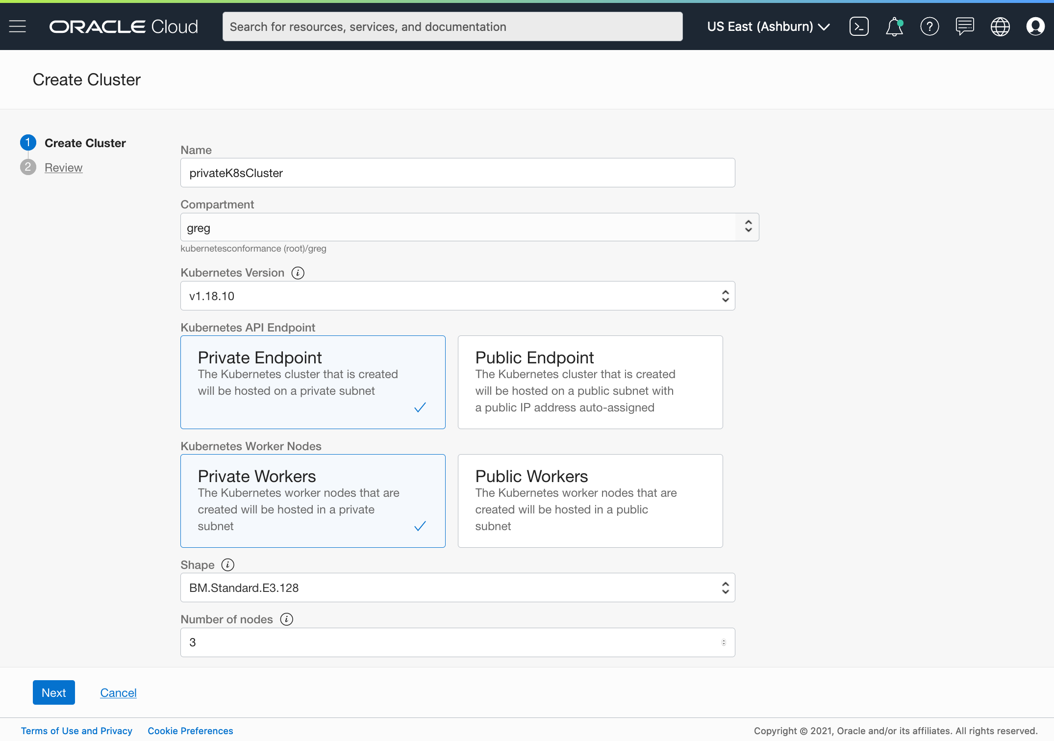 まず、企業ネットワーク内の承認されたサブネットからKubernetes APIエンドポイントにアクセスするには、エンドポイントのプライベートサブネットを指定します。 この場合、通常、OCI FastConnectを使用してVCNを企業ネットワークにピアリングします。これにより、データセンターとOracle Cloud Infrastructureの間に専用のプライベート接続を簡単に作成できます。