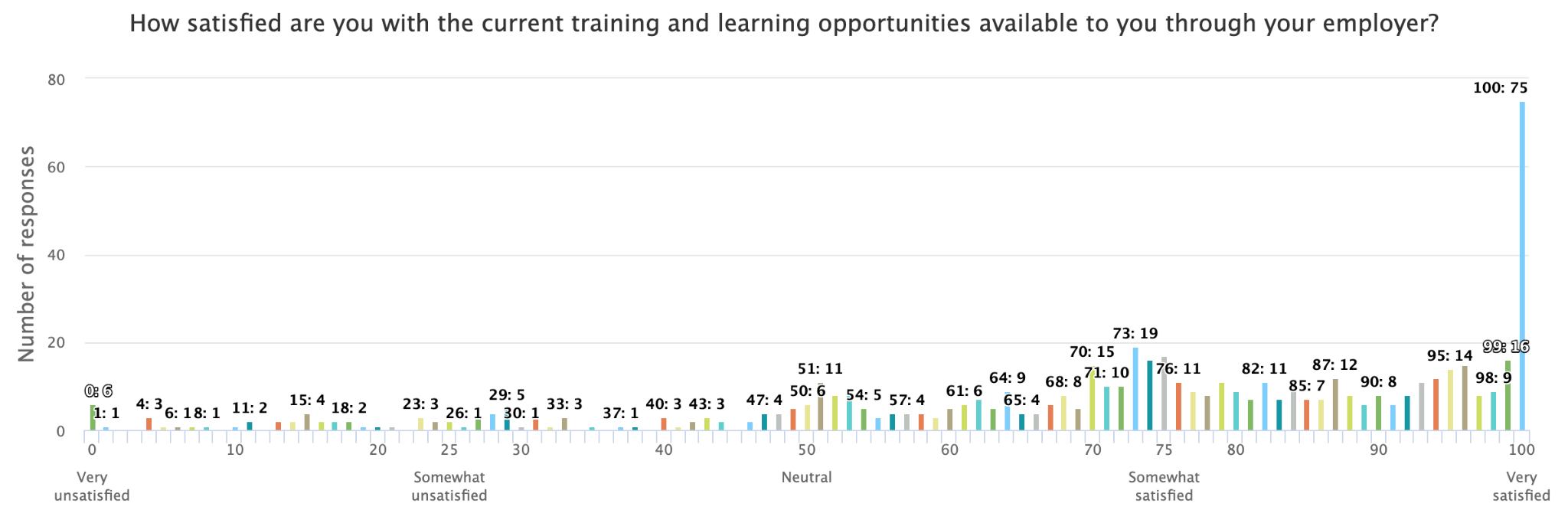 The good news is that most employees rate their training and learning experience at work fairly positively. When asked, “How satisfied are you with the current training and learning opportunities available to you through your employer?”, the median answer was 76 on a scale of 1 to 100 (1 being very unsatisfied and 100 being very satisfied).