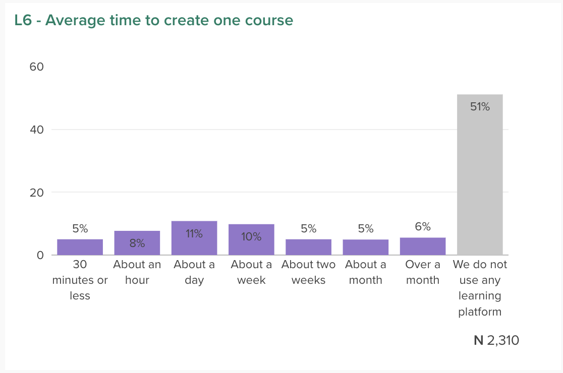 This lack of relevant and tailored training can be explained in large part by the time that it takes an average L&D team to produce one training course. In our survey of 2,310 HR decision-makers of those that use a learning platform, most said it took a day or more to create one course. 22% said it took about a month or more!
