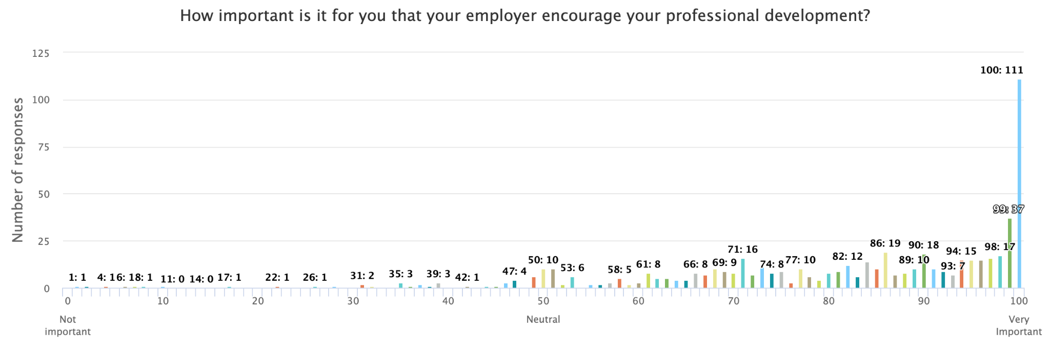 Our data suggests younger generations find learning and training opportunities slightly less important (ages 18-34 had a median of 80). Those over 54 had a median of 80.5.