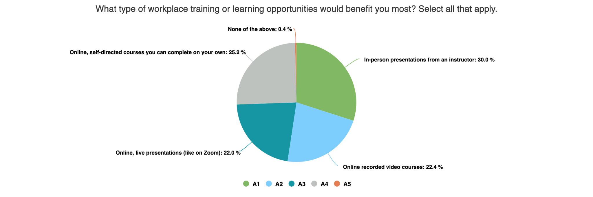 When asked, “What type of workplace training or learning opportunities would benefit you most?”, most people said “in-person training”, followed by, “online, self-directed courses you can complete on your own”.