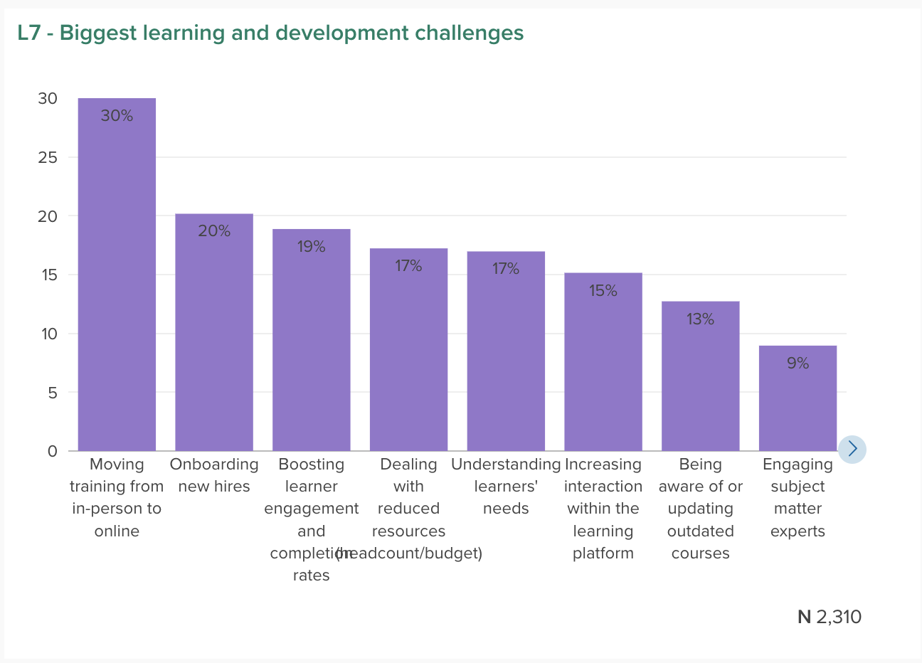 This data suggests there are clear learner expectations regarding professional development training opportunities: either make them available, or your teams will walk. Mentorship programs, manager training, or course creation based on subject-matter expertise are promising ways for L&D teams to bring a relevant professional development component to their training programs.