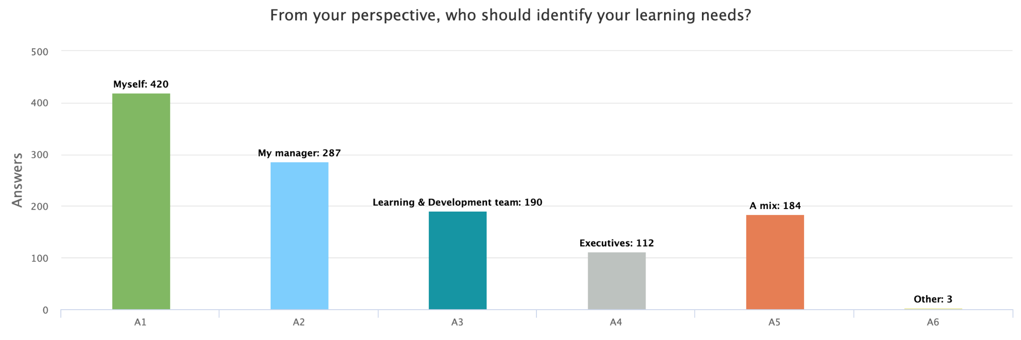 To continue with the theme, when asked who should identify their Learning Needs, most (70%), said “myself”. The least chosen answer was ‘Executives’, which suggests there is a lot of appetite for decentralized learning strategies.