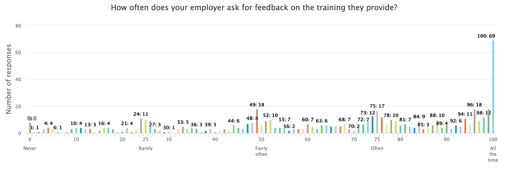 On the bright side, respondents indicate that employers are often asking for their feedback about their training experiences (a median score of 73 out of 100), suggesting a growing commitment to iterate and improve the learning process: