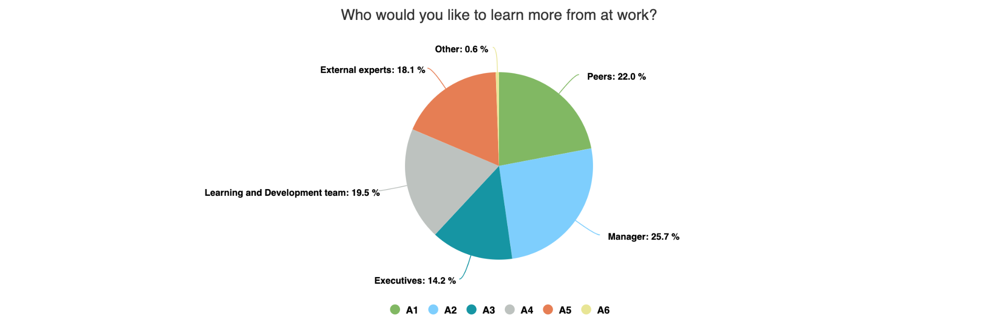 The top two answers for the question “Who would you like to learn more from at work?” were “manager” and “peers”, with “L&D” not too far behind. This desire to learn more from colleagues indicates a growing interest in peer learning, and sharing the collective wisdom held by internal subject-matter experts. Wanting to learn from one’s manager could also show support for the 70-20-10 rule, which argues people tend to learn 70% of their knowledge from challenging experiences and assignments.