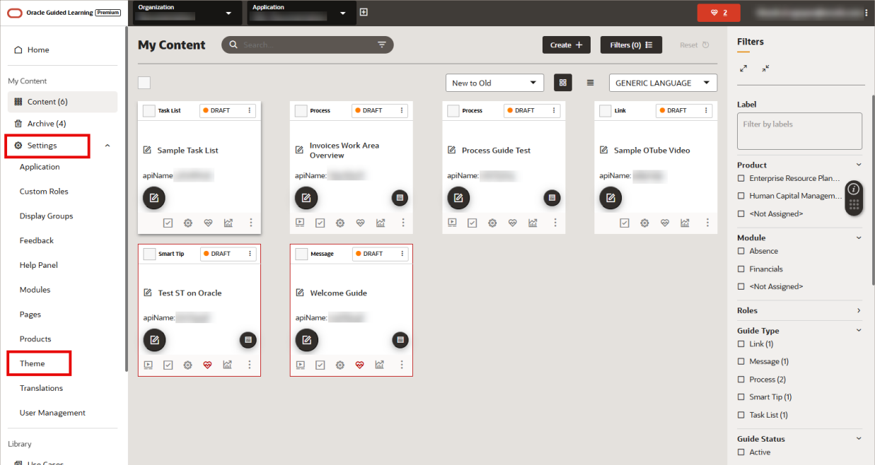 In the Themes section, users can choose from a list of available themes to edit or create a new Blank Theme.