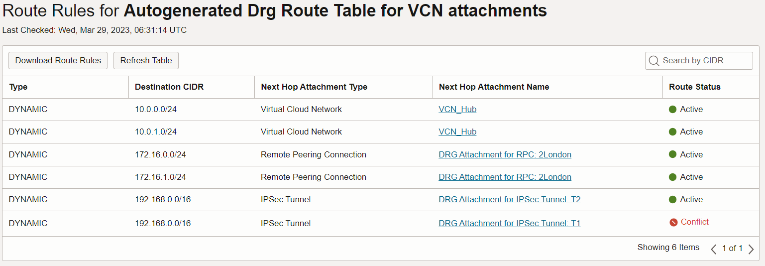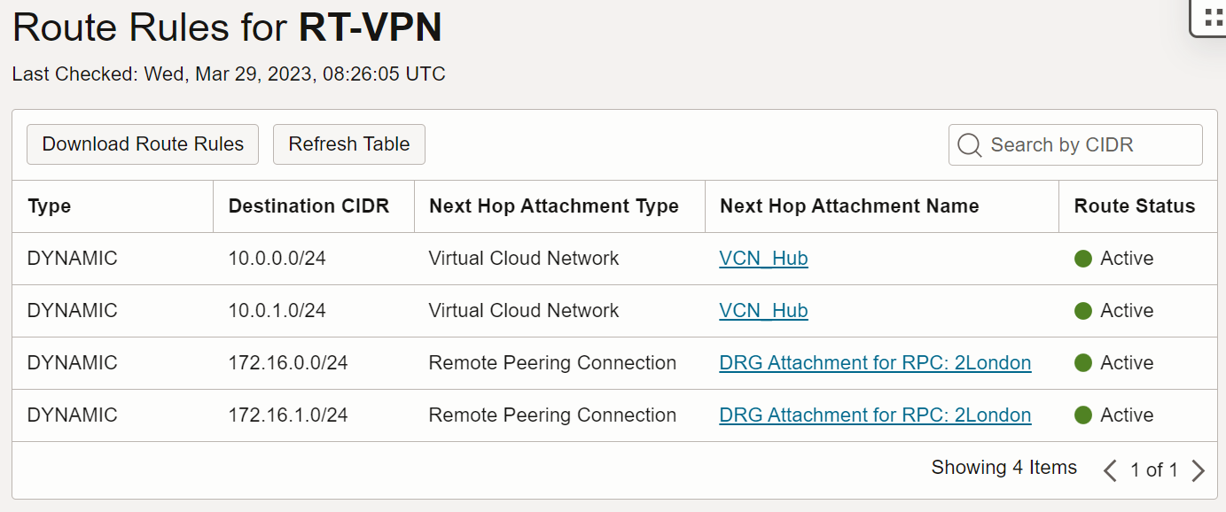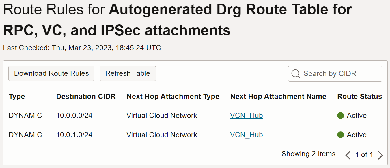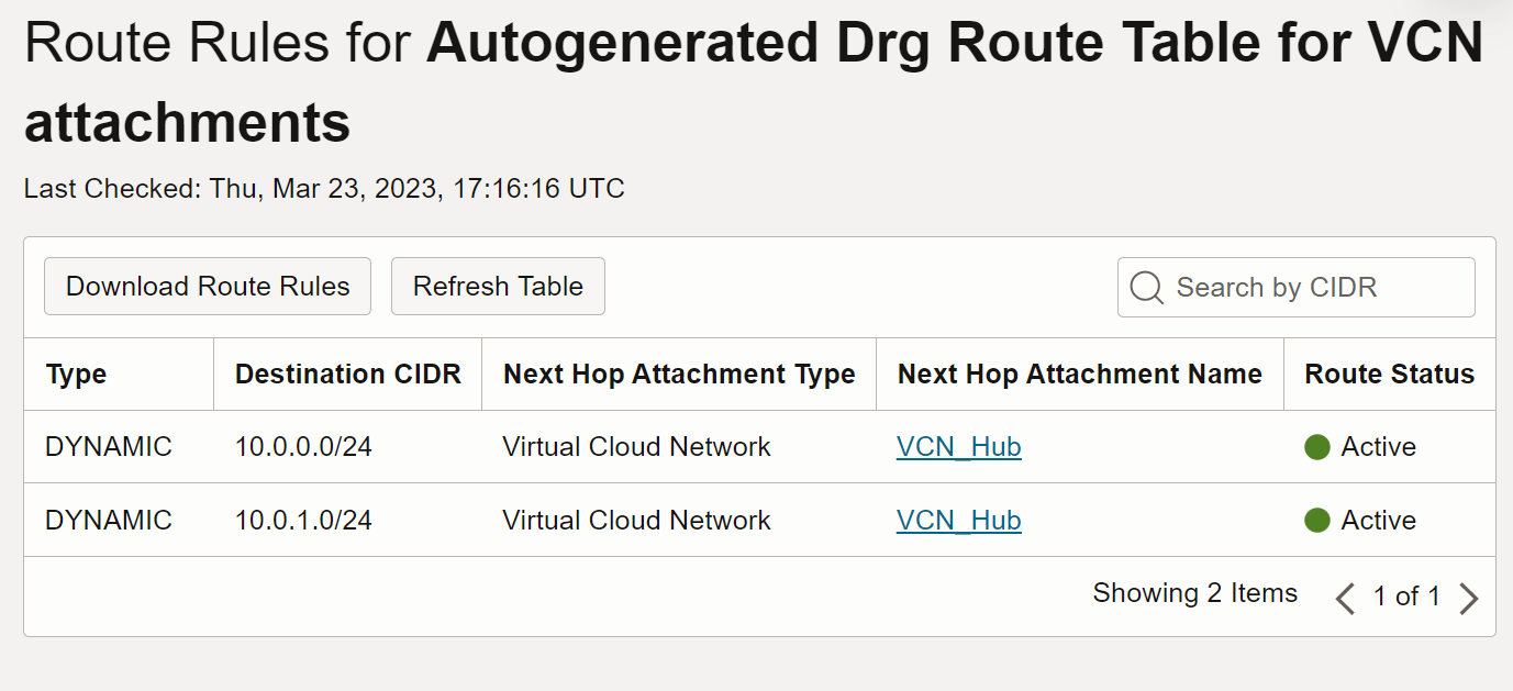 If you now also check for the Route Rules in the Autogenerated DRG Route Table for RPC, VC, and IPsec attachments you will only see the rules for VCN. See image 3.
