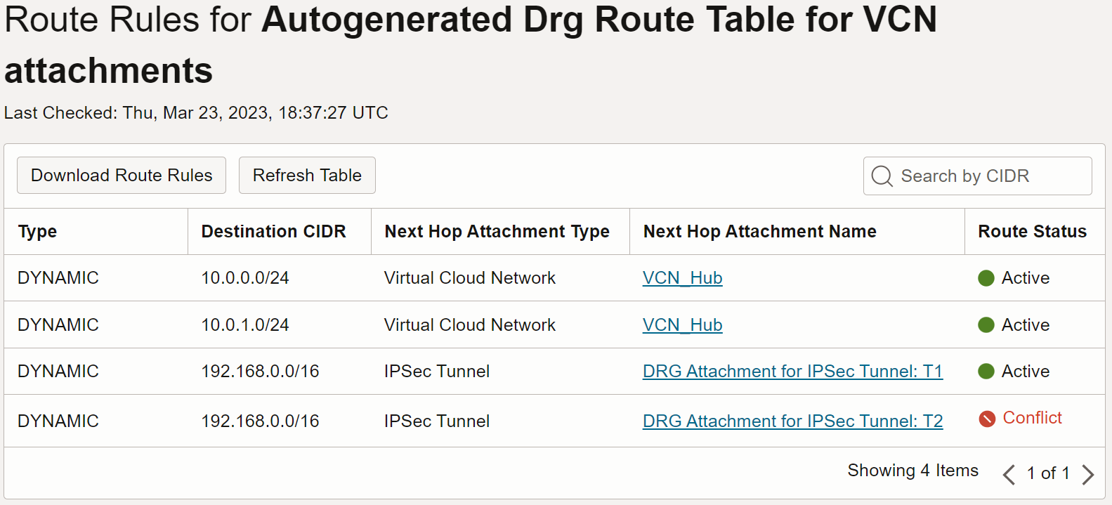 Notice that the route distribution now routes to the IPSec Tunnel in addition to the VCN.