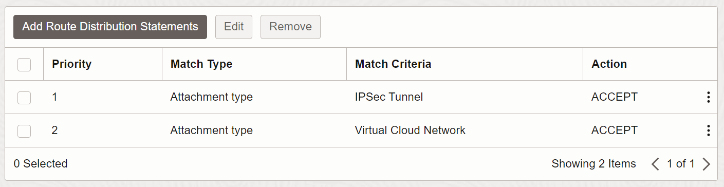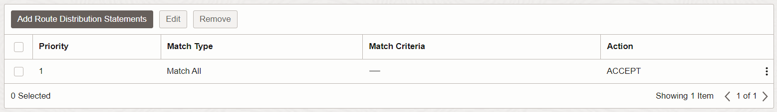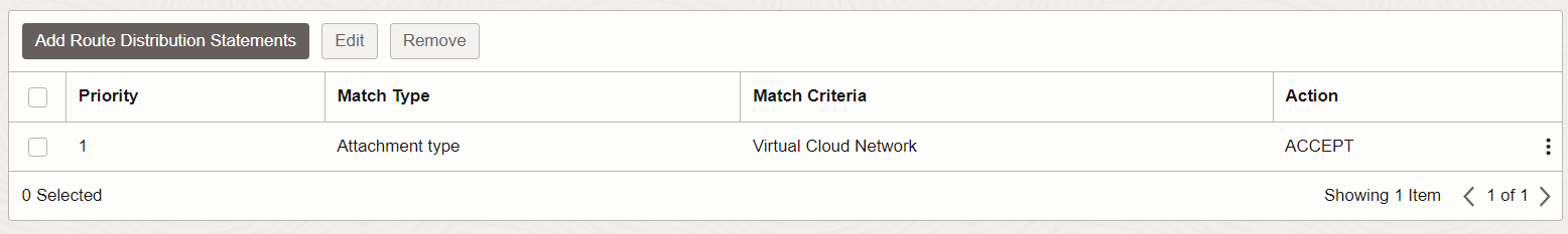 On the other hand, the Autogenerated Drg Route Table for VCN attachments route table is associated with the Import Route Distribution: Autogenerated Import Route Distribution for ALL routes. This route distribution matches on all routes, without a match criteria.