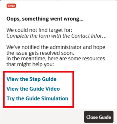 - For any end user running a process guide and faces an interruption in the guide run, the user is provided with an assistance modal letting them know that there seems to be an issue with the guide.