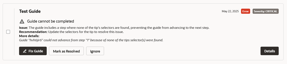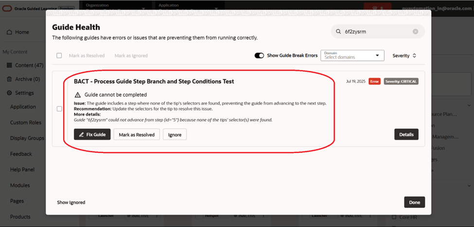 - The content developers receive a guide health error containing details about the specific step that is problematic in the guide, allowing them to perform a quick fix.