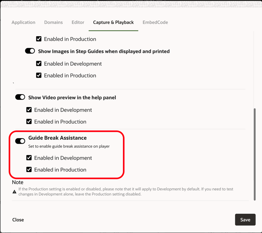 Enable the “Guide Break Assistance” setting in “Capture & Playback” in Application Settings. The setting enables the end user experience of the feature.
