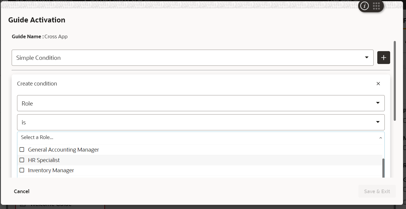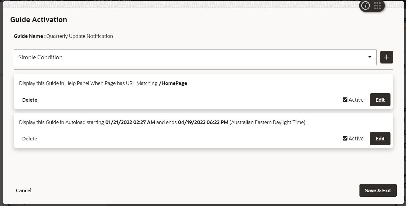 - Simple Conditions – offer a simplified process of setting activation conditions by leveraging predefined pages and user roles. You’re able to set guides to ‘autoload and appear in your Help Panel and/or application page. You’re able to define who you want this guide to be shown to. You’re able to display where the guide appears (what page it appears on).