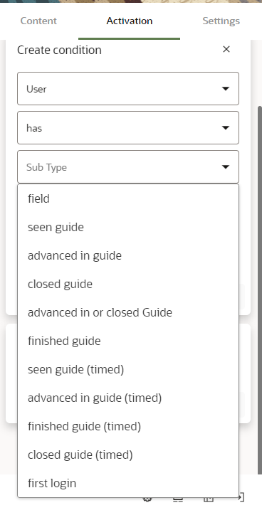 Figure 2: Snippet of Activation Conditions modal in the Guide Editor, showing options of segmentation by user