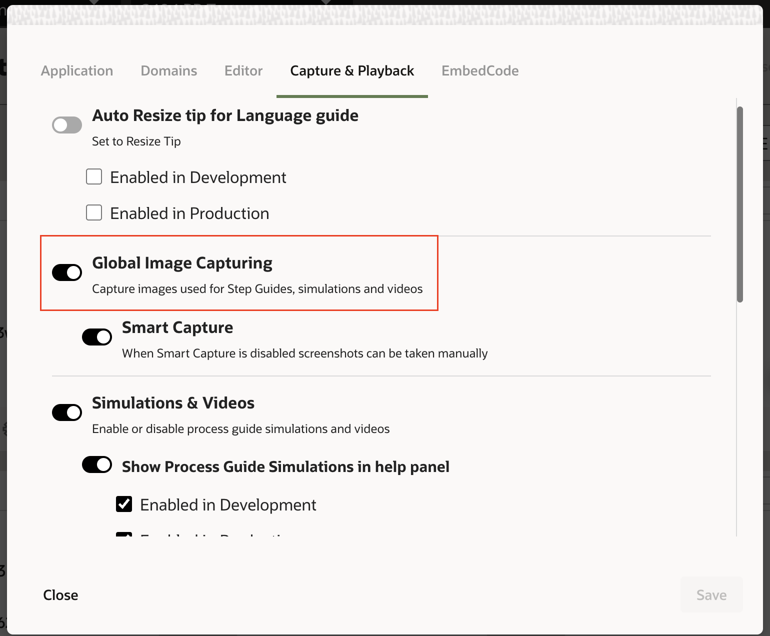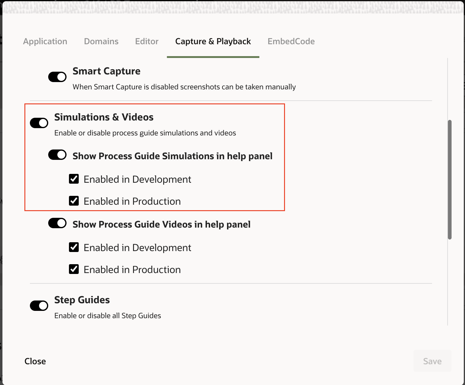 These settings are also available at the guide level for individual Process Guides and determine whether Simulation is visible to the end user.