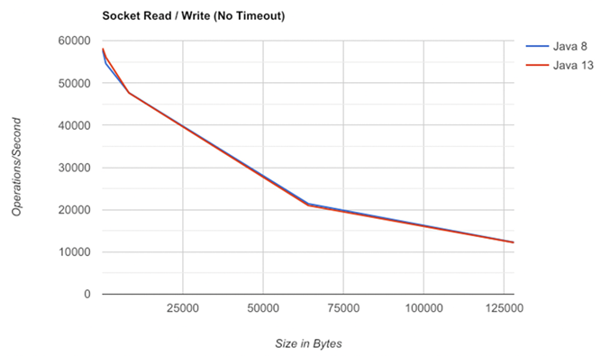 さらに、I/O Streams APIを使ってパフォーマンスをテストするSocketStreaming.testSocketInputStreamReadベンチマークも実行しました。このベンチマークでは、Java 8とJava 13の両方の実装で44ミリ秒/opが達成されました。