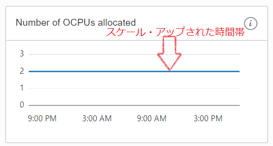 さて、最後に課金がどのようになったのか見てみます。こちらもサービス・コンソールの画面から確認できるOCPU数のグラフ(1時間単位)です。今回、下記のグラフの矢印のあたりが自動スケール・アップされた時間帯ですが、、、あれ?OCPU数が2のまま?!お得?!