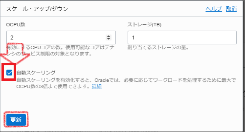 $ oci db autonomous-database update --autonomous-database-id <Autonomous Databaseインスタンスのocid> --is-auto-scaling-enabled [true/false]