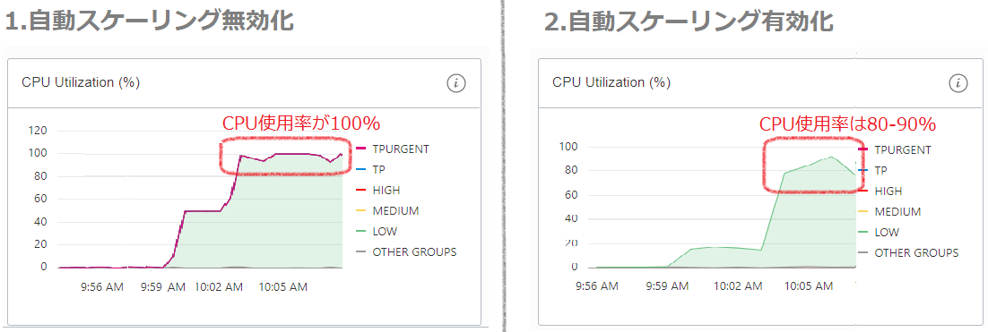 無効化しているインスタンスは、処理数を増やしたところからずっとCPU使用率が100%で張り付き、リソースが逼迫している状態で動き続けています。対して有効化しているインスタンスは処理数を増やしたところで一気にCPU使用率が上昇しますが、スケール・アップされたため利用可能なコア数が増えことから、100%にはならずにリソースに少し余裕がある状況で実行されていますね。(もちろん負荷によっては3倍のリソースでも不足することもあるので、スケール・アップしたとしてもリソース枯渇する可能性はあります)