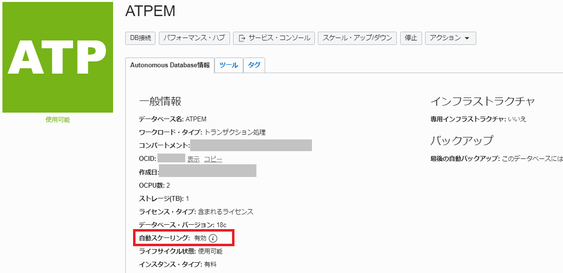 自動スケーリングによるスケール・アップ/ダウンした場合は、OCPU数に応じて設定される各種設定はそのままの設定で動き続けます。具体的には、メモリサイズや事前定義済の接続サービスで設定されているパラレル実行数や同時実行セッション数等の設定などは、有効にしているベースのOCPU数に基づいた設定が利用されます。