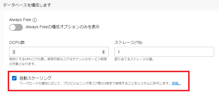 Autonomous Databaseを新規で作成する際に、そのインスタンスで自動スケーリング機能を有効にするかどうかを指定します。後からの変更も可能です。