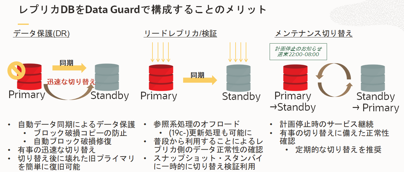Oracle Data Guardとは、変更履歴(REDO)を利用して自動でリアルタイム・データベース複製を持つことが出来る機能です。この機能を利用することによって、データベース障害やリージョン障害などのRTO/RPOを短くすることができ、広範囲な計画停止(メンテナンス)においても切り替えることによって停止時間を極小化することが可能です。バックアップを取得していても、有事の際の復旧において、大量データのリストアが必要になる場合ではRTOを満たせないケースもあります。こういったケースに備えて、バックアップだけでなく、すぐに切り替えられるスタンバイを持つことは重要です。災害対策(DR)としてのデータ保護はもちろんのこと、移行やアップグレードの停止時間短縮といった利用用途もあります。また、参照専用として利用可能なActive Data Guardにしたり、一時的に読み書き可能なスナップショット・スタンバイとして利用したりと、普段から利用できるスタンバイ・データベースを持つことができます。参照処理をオフロードしたり、この仕組みを応用してデータ破損が検知された場合にクライアントにエラーを返すことなく自動修復をしてくれる自動メディア・ブロックリカバリ機能も使えるため、Data Guardであればスタンバイのリソースも有効活用してROIを高めつつ、きちんと切り替えられるスタンバイを持つということが可能です。