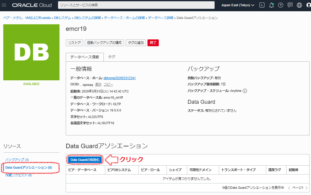 1.プライマリDBシステム上のプライマリ・データベースの『データベース詳細』ページから、『Data Guardアソシエーション』を選択