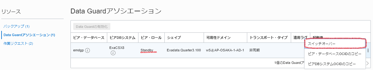 スイッチオーバーは主に計画停止用途のもので、スタンバイにREDOを転送・適用をしきった状態で、プライマリとスタンバイを切り替えます。そのため、切り替え後には旧プライマリは新スタンバイとしてData Guard構成を保った状態となります。スイッチオーバーは、プライマリDBシステムのData GuardアソシエーションのスタンバイDBが表示されている箇所から実行します。