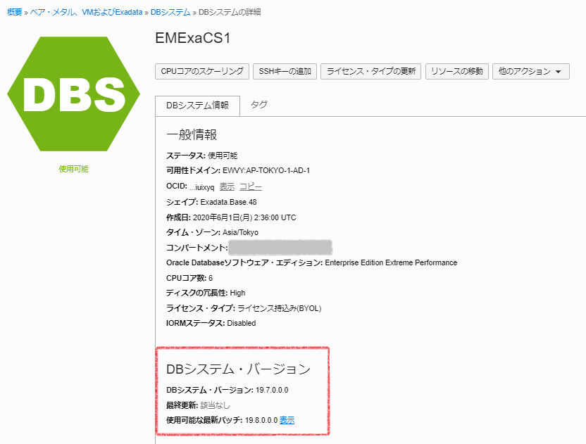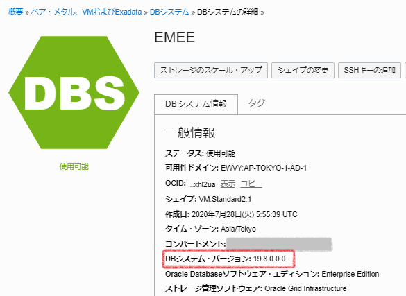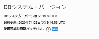 『DBシステムの詳細』ページで、「DBシステム・バージョン」というのが、Grid Infrastructureのバージョンを指します。今回の環境は、19.7.0.0 の状態です。