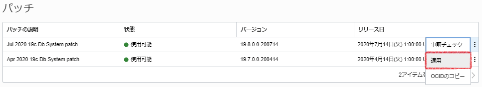 Real Application Clustersで2ノード構成になっている場合は、ローリングで一台ずつ適用されます。適用が完了すると、DBシステムのステータスが「使用可能」になります。バージョンが、19.8.0.0になってますね。また、適用したパッチは、「パッチ履歴」のリストに表示されます。