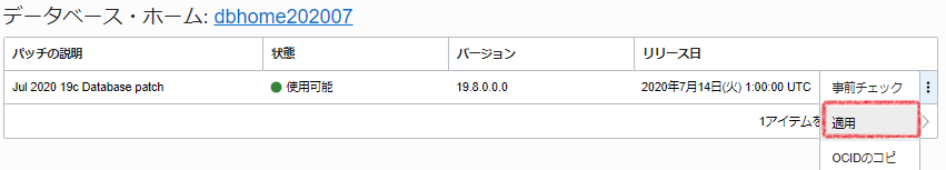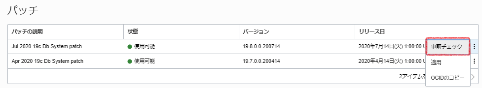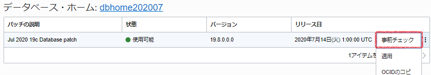 「データベース・システム」のセクションに、適用可能なパッチリストが表示されます。今回は19.8.0.0を適用してみます。適用したいパッチの右の…をクリックして、『事前チェック』をしてみましょう。この環境に適用できるかどうか(コンフリクトなど)をチェックが走ります。Opatchのprereqなどが実行されるイメージです。