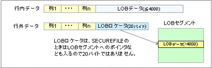 最近は、非構造化データを使用するようなシステムが増えてきましたので、そのようなデータを扱うLOBデータ型(LOB)についても重要なってきています(LOBを使用することで、構造化データと同じように扱うことができます)。LOBは、第25回で説明したSQLオブジェクト型やXMLDBなどでも内部的に使用しています。LOBは、通常のセグメントとは異なる管理を行いますので、同じように使用しても性能が出ませんので注意が必要です。データサイズが4000(正確には3964、後から説明するSECUREFILEは3968)バイトを超えると(または”disable storage in row”を指定すると)、以下のように行外データとして別セグメント(LOBセグメント)に格納します(デフォルトは表セグメントと同じ表領域に格納します)。ただし、行内データは表セグメントのOracleブロック数を増加させますので、LOBデータ以外へのアクセス性能が低下します。つまり、LOBデータに頻繁にアクセスしないシステムでは、効率良くないので注意してください。