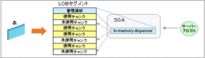 - 基本はLOB索引を使用しません(行データに格納されているLOBセグメントへのポインタを使用します)。未使用領域の検索は、LOBセグメント内の管理情報(領域の使用状況)を共有メモリ上の”in-memory dispenser”にキャッシュされますので、それを使用して行われます(つまり、メモリ上のアクセスのため高速です)。”in-memory dispenser”に存在しない場合には、管理情報を参照して”in-memory dispenser”の更新を行います(このときRETENTION期間を過ぎているチャンクも更新されます)。