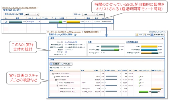 Oracle Database 11gから図のようなOracle Enterprise Managerの「リアルタイムSQL監視」を使用することで簡単にSQLを監視できます(実行中のSQLを自動で監視(各ステップでの詳細な待機アクティビティなどの統計情報を取得)してグラフィカルなレポート画面から分析ができる)ので、これを使用することをお勧めします(時間かかるSQL文については、私もこれは非常に楽だと感じています)。