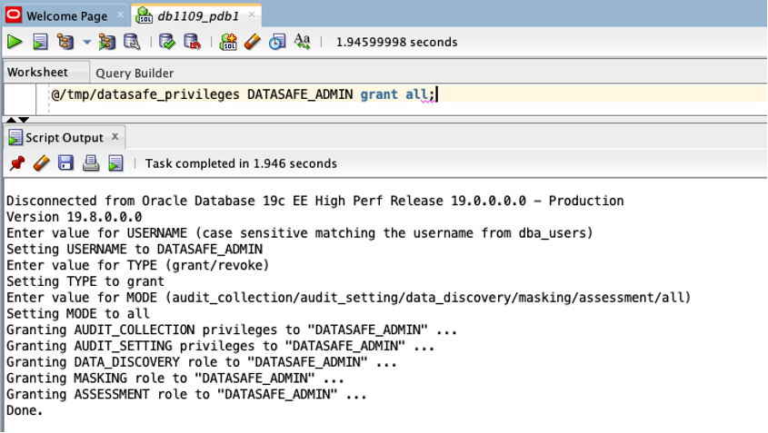 これらの権限は個別に設定しても、まとめて設定しても、構いません。この例では、5つの権限すべてをアカウントに設定します(下の図で「grant all」と表示されています)。なお、データ・マスキングは非本番環境でのみ実施されるものなので、本番環境には、データ・マスキングの役割を設定しないことをお勧めします。