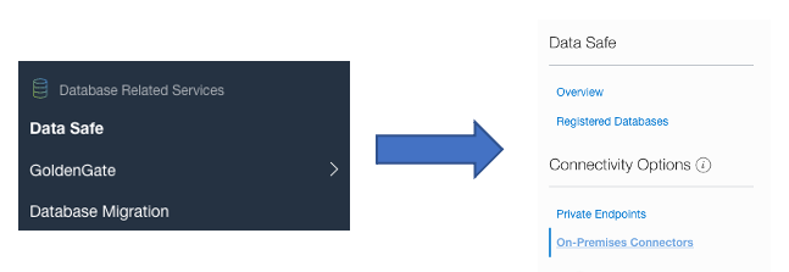 オンプレミスのOracle DatabaseとData Safeを接続するための最初のステップは、OCIコンソールのオンプレミス・コネクタの登録です。OCIのメニューから「Data Safe」サービスにアクセスし、「On-Premises Connectors」を選択します。