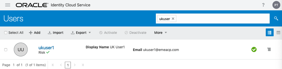 上記のレポートにはログインに失敗したユーザーが表示されなかったため、Oracle IDCSがそのユーザーについて知らないのではないかと私は考えました。そのため、次のステップとして、このユーザーが実際にOracle IDCSに存在するかを確認します。同じ管理コンソール内で、「Users」に移動し、このユーザーを検索します。