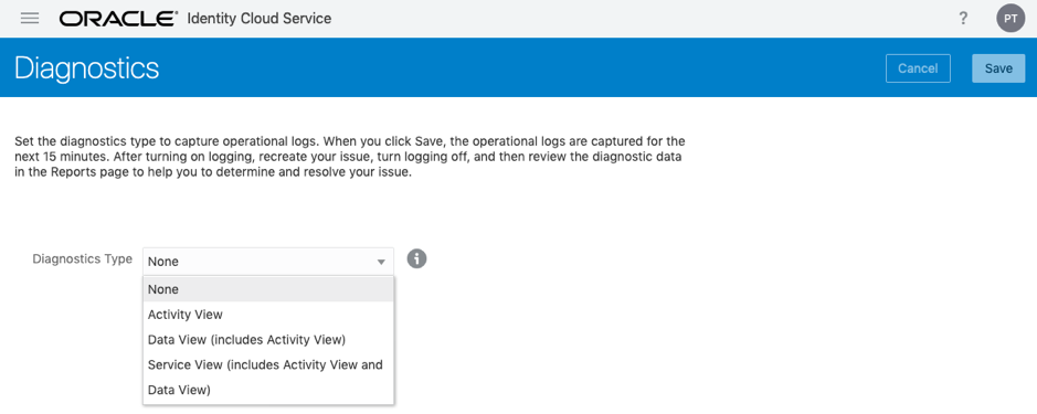 Diagnosticsを使用するには、有効化する必要があります。Oracle IDCS管理コンソールで、以下の項目を選択します。