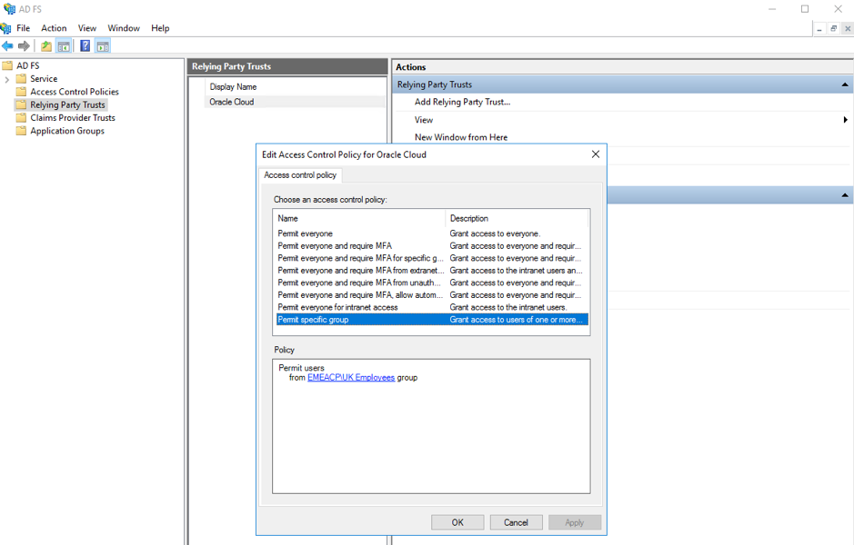 この例では、問題はADFS側にあるようです。ADFSで調査を行ったところ、私の環境内のフランスのユーザーがOracle IDCSへのフェデレーションを許可されていないようでした。これは、ADFS Access Control Policyに定義されています。そのため、ADFSは上記のとおりRequestDeniedステータス・コードを送り返しています。