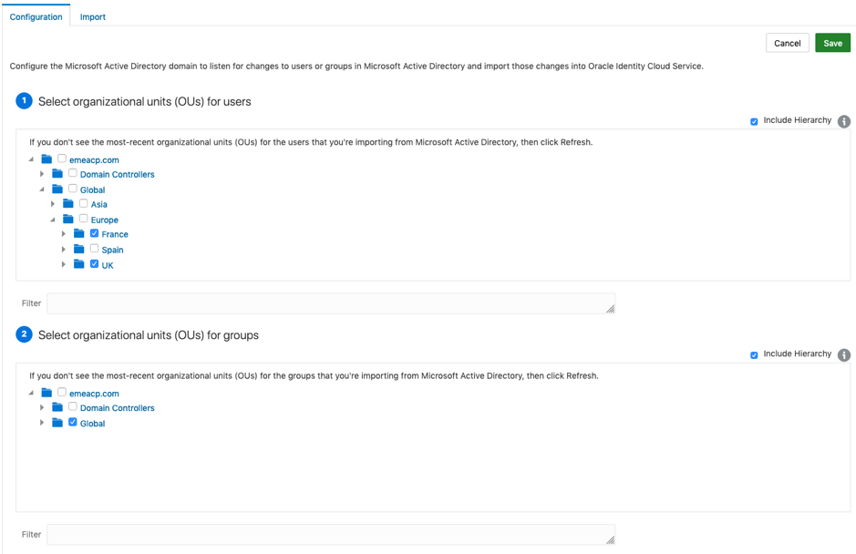 ここでは、UKとFranceのOUを選択しており、特定のユーザーを除外する可能性のある固有のフィルタは存在しないことが分かります。また、Global OUの下ですべてのグループを同期しています。いずれのケースでも、ネストされたOUがある場合に備え、「Include Hierarchy」をチェックしています。