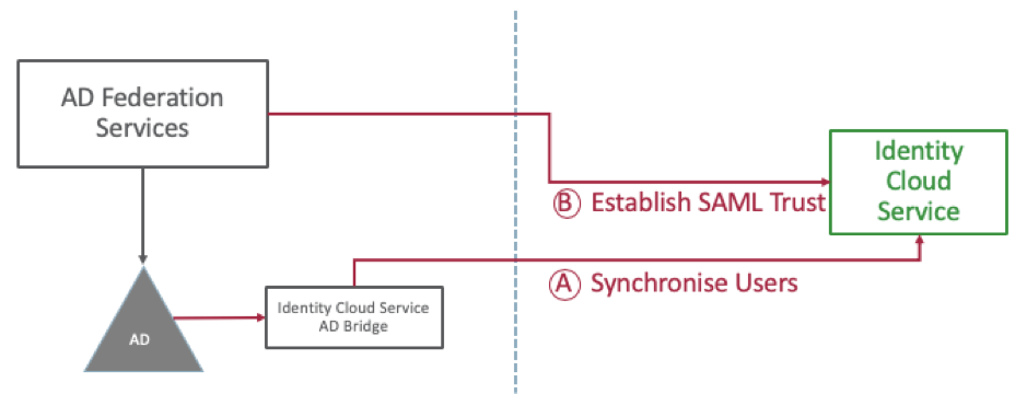 AD(またはAzure AD)からOracle IDCSへのユーザーの同期はよくある要件であり、一般的には、ADからADFS経由でOracle IDCSへのシングル・サインオン(SSO)を可能にするために、フェデレーションと共に使用されます。AD Bridgeのセットアップは、Oracle IDCSとADFSの間にフェデレーションをセットアップするのと同様に、非常に簡単です。以下の図に示すとおり、単純な2段階のプロセスで構成できます。これらについては、こちらとこちらのチュートリアルで説明しています。