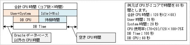 CPU時間には、User, System(Sys), Idle, Wioがあり(IdleとWioはどちらも未使用時間として考えます)、CPU全体の時間に対する比率とCPUコア毎の時間に対する比率があります(それぞれの比率がvmstatなどのOS統計情報に出力されます)。以下の図では簡単にするために全体(CPUコア数が2)の時間としてCPU使用率(75%)を求めています。これにAWRなどに出力される「DB CPU」や「DB Time」を一緒にすると以下の図のような関係になります。「DB Time」がOracleデータベースが動作している時間、「DB CPU」がその内でCPUを使用している時間です(これの最大はUser+Sys時間ということですので、User+Sysより小さい場合はOracleデータベース以外のアプリケーションなどが使用していることになります)。AWRなどの「Top 5 Timed Events」に出力される「%Total Ela Time」は「DB Time」に対する比率になります。つまり「DB CPU」についてはOracleデータベースが動作している時間に対するCPU時間の比率になります(この時間が100%に近いと待機がない訳です)。以下の例ですと60%(60秒/100秒)になりますので40%が待機時間になります。CPU使用率については、瞬間的に変化するため取得するタイミングによって(取得する時間がずれると)異なってきますので、多少の誤差はあると思って下さい。
