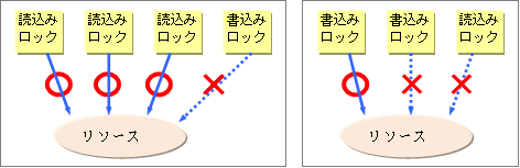 トランザクションは、データを他のトランザクションから保護するために(データの一貫性のために)、ロックの機能を使用します。ロックを多用すると他のトランザクションはデータにアクセスすることができないために並列性が低下します(そのため、どこまでロックするかはパフォーマンスに大きく影響します)。このロックには、読込みを行う前に獲得する読込みロック(同時に複数獲得できることから共有ロックとも呼ぶ)と書込みを行う前に獲得する書込みロック(同時に獲得できないことから排他ロックとも呼ぶ)があります。以下の図のように、読込みロック中には書込みロックだけが獲得できませんが、書込みロック中には何も獲得することができません。