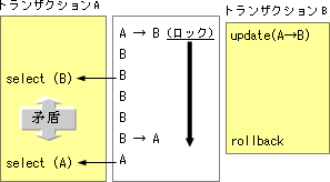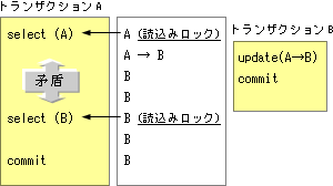 ロックの獲得/解放は2相ロッキング(ロックはデータをアクセスする直前で獲得し、トランザクション終了後に解放する)を使用しているため、リソースはトランザクションが終了するまで解放されません。そのため、同一データを多数のユーザがアクセスするときに、ロックの保持時間が長い場合には競合が発生し易くなります(つまり、トランザクションが長いと競合が発生し易くなりますが、短くすると整合性が失われます。これはSQエンキューで説明した欠番が発生するということです)。ただし、読込みロックについては並列性の向上のため、2相ロッキングを使用しないようにできます(保持期間をトランザクションの分離レベルで指定可能になっています)。
