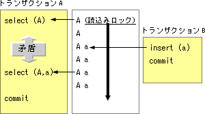 トランザクション内での最初の問合せ後に他のトランザクションによって行を追加されることによって発生する矛盾です。つまり最初の問合せ時に存在しない行に対して読込みロックすることができないために発生します(存在していないデータを保護する必要があるため、これが一番難しいです)。右図の例では、2回目の問合せ前にaを挿入しているため、結果が1回目と異なっています。