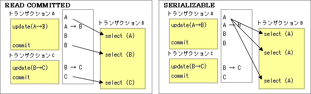 分離レベルは、読取みロックの保持期間によってデータに矛盾が発生することを意味しています。ただし、Oracleデータベースは競合が緩和されるように読込みロックを使用せずに読取り一貫性を行い(その時点でのコミットされてるデータをUNDOセグメントから生成して)、2つの分離レベル(READ COMMITTED(デフォルト)、SERIALIZABLE)を異なる方法で実現しています。この2つのレベルの違いは、UNDOセグメントを使用してどの時点のデータを生成するかです。「READ COMMITTED」はSQL開始時点でコミットされたデータ、「SERIALIZABLE」は非リピータブル・リードが発生しないようにトランザクション開始時点でコミットされたデータとなります(以下の例だとトランザクションBの開始時点でコミットされたデータですので、すべてAになります)。