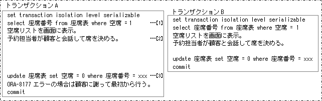 読込みロックを使用していないので、読込み済みのデータを別のトランザクションから更新できてしまいます(この状態で何回読込んでも読取り一貫性によって非リピータブル・リードにはならないので問題ありませんが、ここで最初に読込んだトランザクションが更新すると「SERIALIZABLE」ではなくなります)。そのため、トランザクション開始時点から別のトランザクションで更新されたかのチェックをして、そのデータを更新した時点でエラーにしています(つまり、最初にアクセスしたトランザクションが更新できないとエラーにすることで「SERIALIZABLE」を実現しています)。以下の例では「【3】決めた席を更新する」ときに、その席をトランザクションBで既に更新していた場合は”ORA-8177: can’t serializable access”エラーが出力されて矛盾が防止されます。