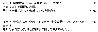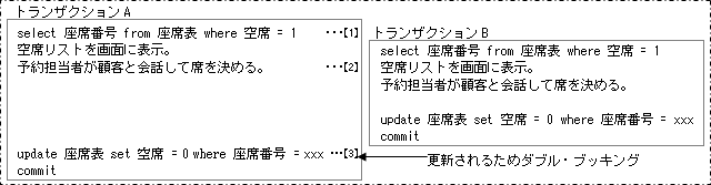 このダブル・ブッキングについては、以下のようにSQL文(空席のときのみ更新する)と運用で回避が可能なため、多くのシステムでは性能のためにこのように行っていると思います。このようなことを知っておくことも重要です。